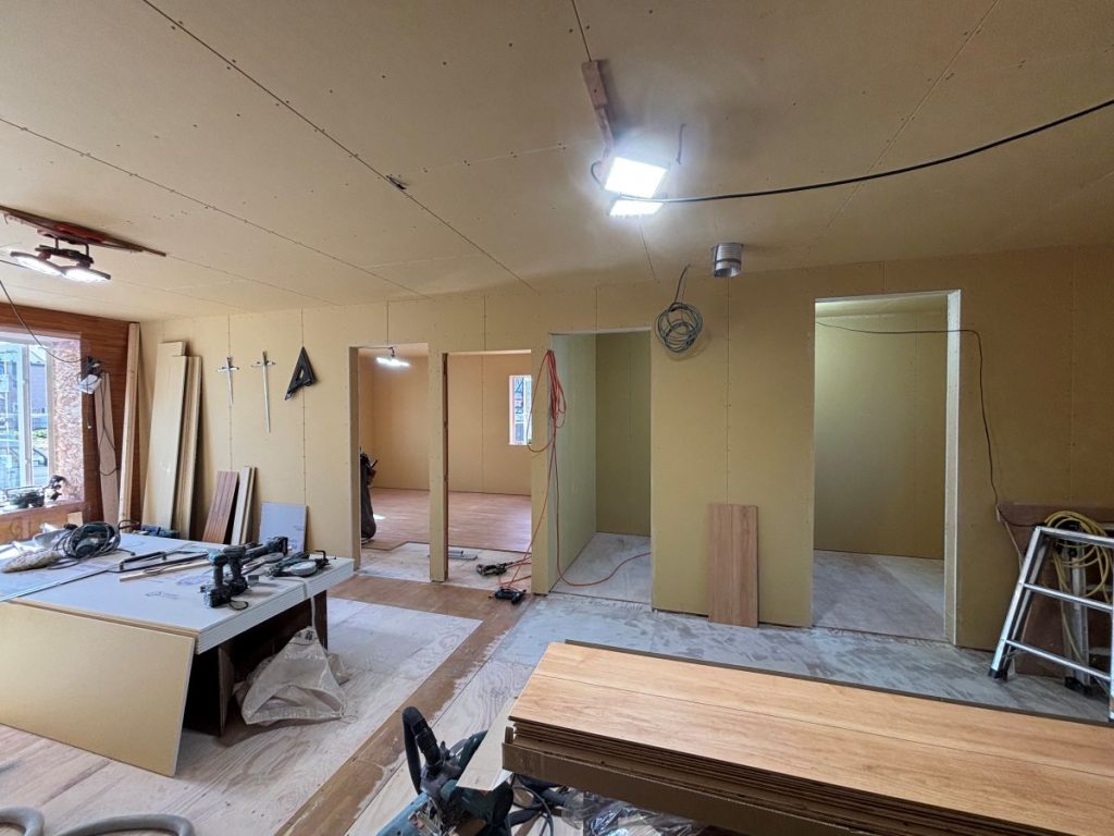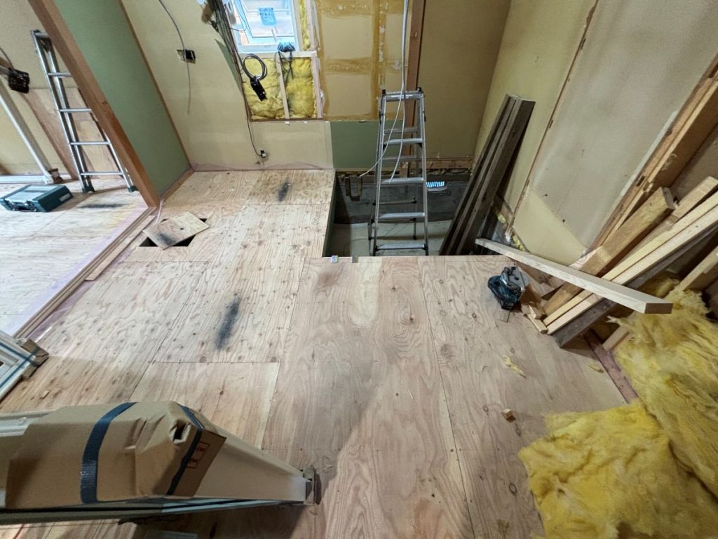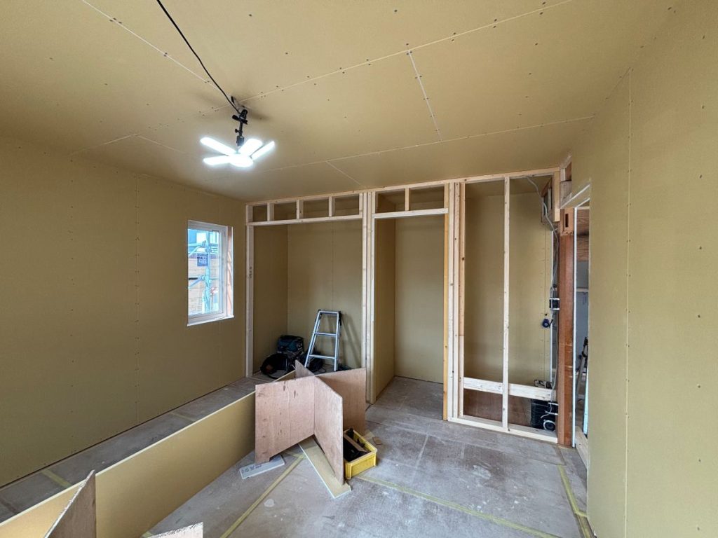 床下地の合板を施工した後に間仕切り部分を施工し、ボード施工に入りました。