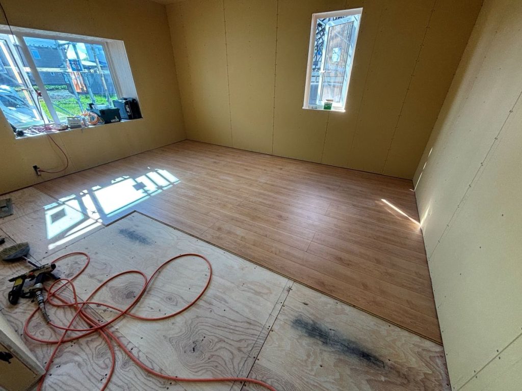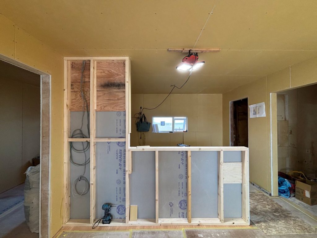 フロア施工が完了した後、寝室の収納部分とキッチン部分の間仕切りを施工していきます。