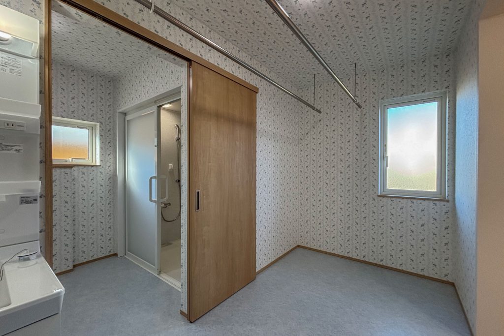 洗面室には、洗濯物を沢山掛けれるように物干しバーを2本設け、洗面室に新たに窓を新設しました。