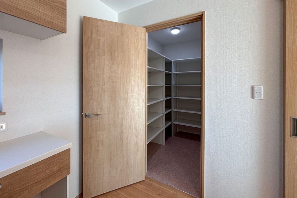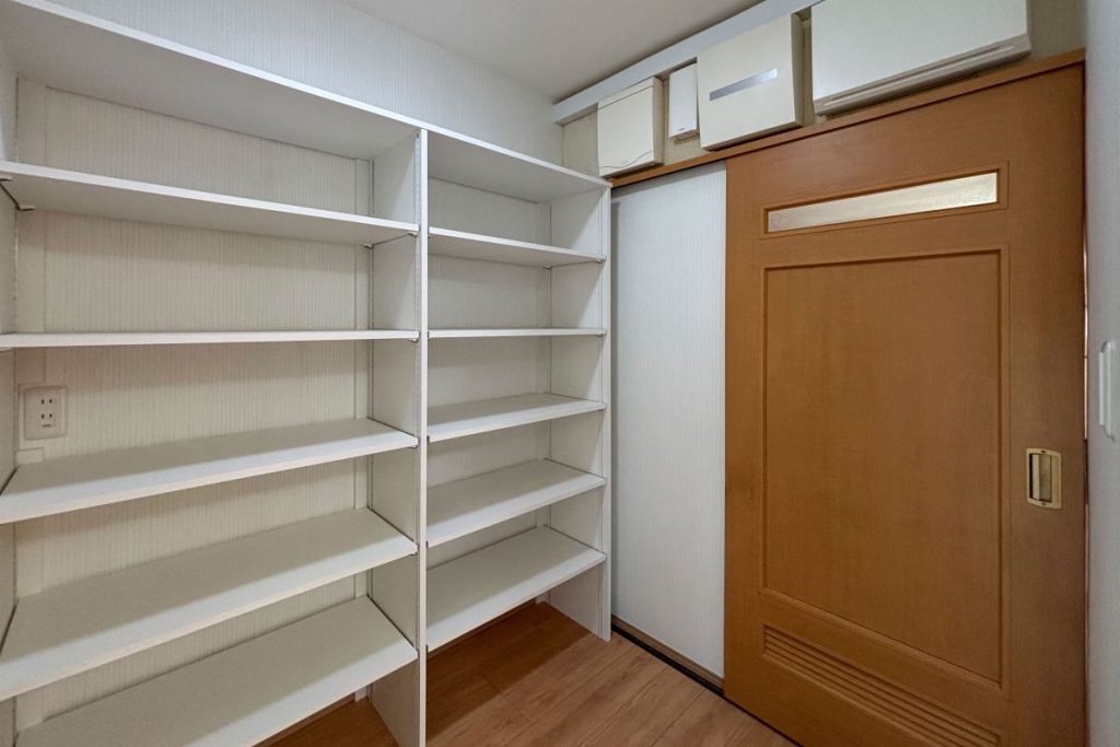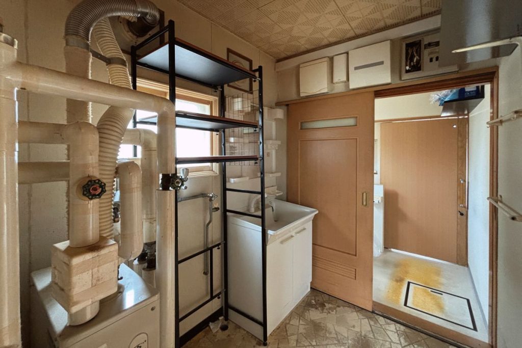 既存の浴室と洗面室のところは、物入として活用できるように可動棚を設置しています。