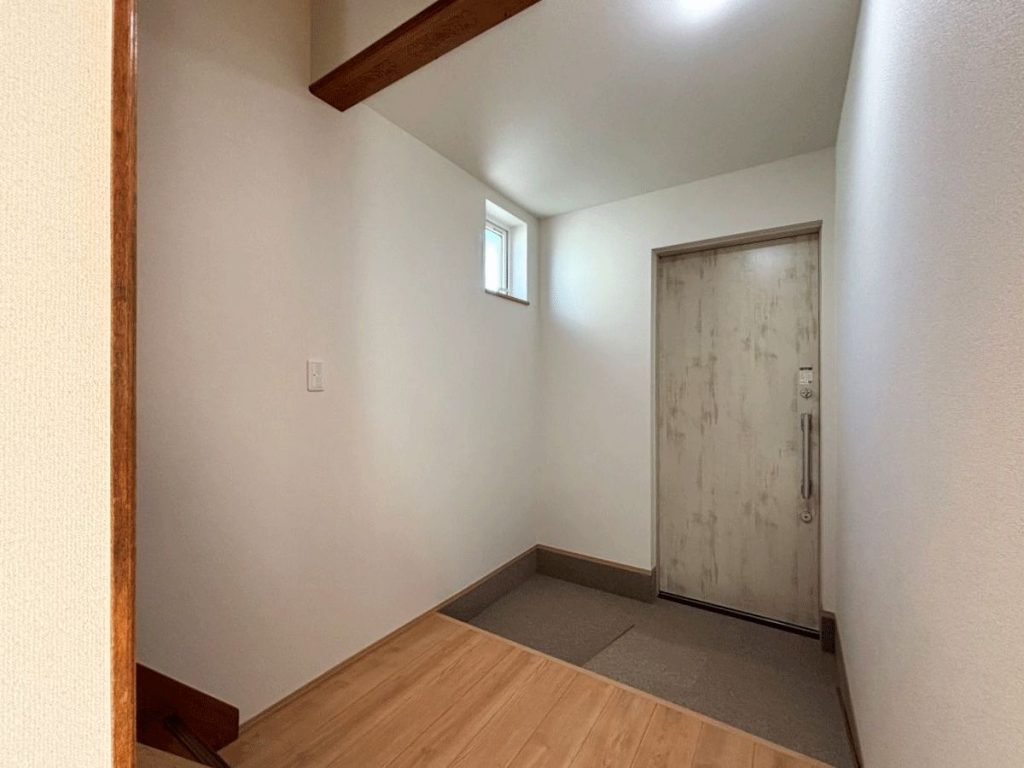 既存の玄関ドアと違い、ガラスなしのものを採用しているので新たに小さな窓を設けています。