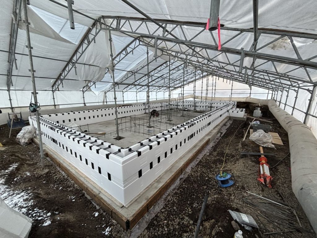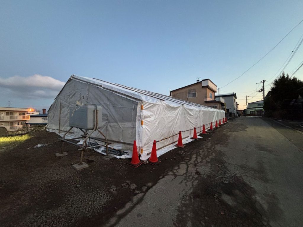 北海道の冬は、マイナス気温まで下がりますので養生ハウスを組み立ててから行います。