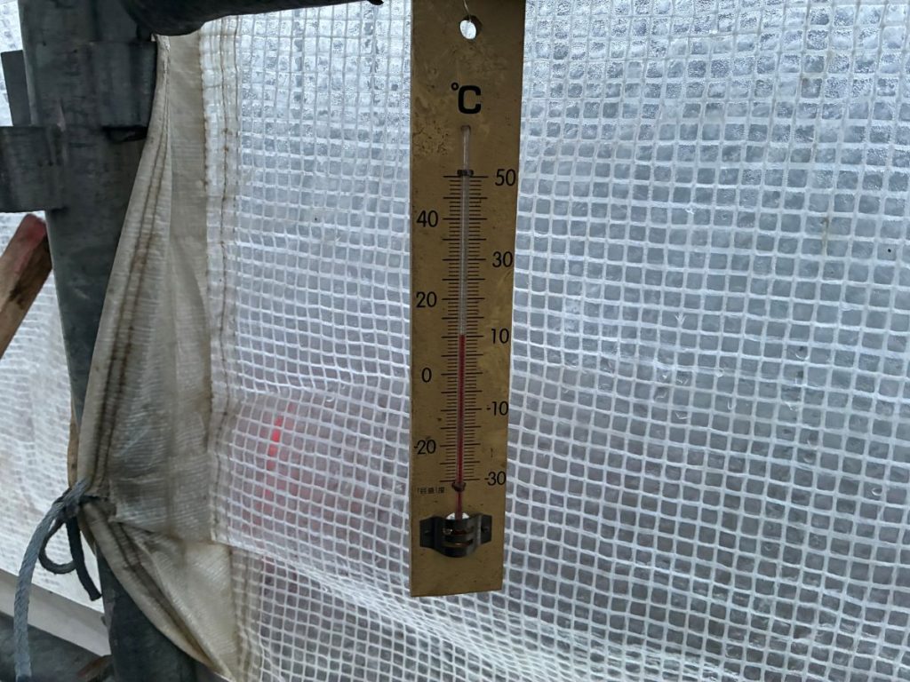 そのため、養生ハウス内の温度を10℃以上保っているか2箇所に温度計を置いて管理しています。