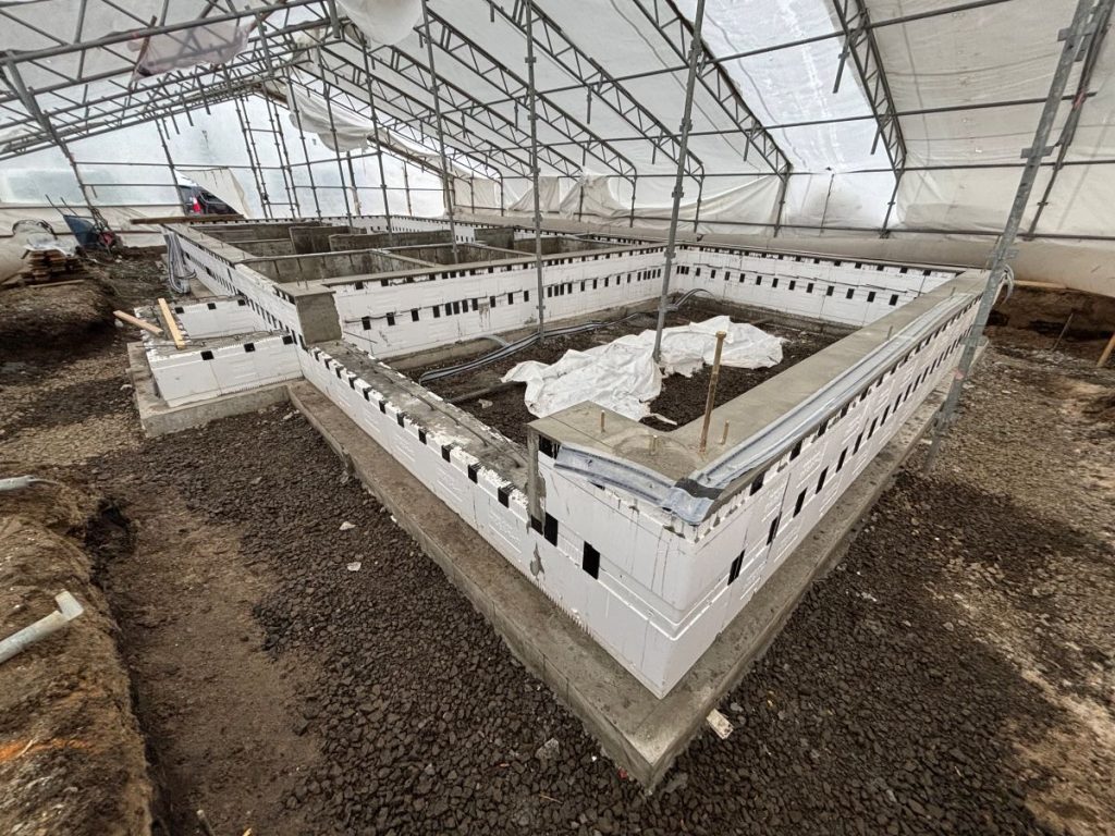 養生ハウス内での作業でしたので、埋め戻し前に基礎表面のモルタル仕上げも行いました。